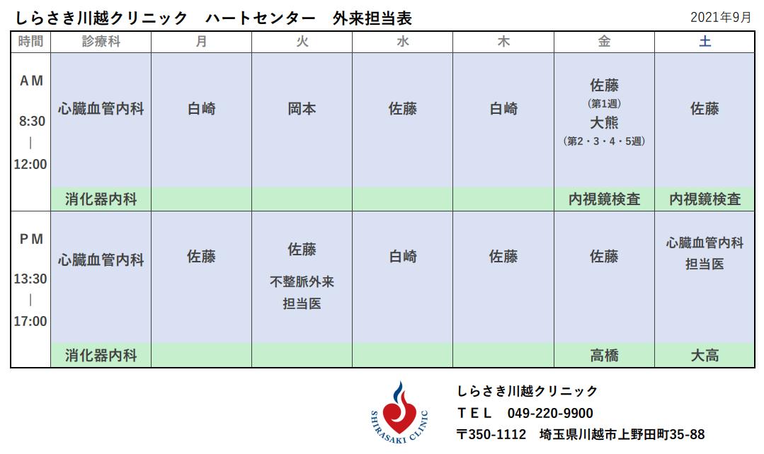 9月からの担当医師のお知らせです。 お知らせ 2021/09/01 診療時間は 祝日を除く月曜~土曜 9:00~12:00 14:00~17:00 です。診療時間の30分前から受付しています。 2021年9月からの外来の担当医師は以下のようになります。 資料ダウンロード [201.0 KB] « 前ページ一覧に戻る 次ページ »